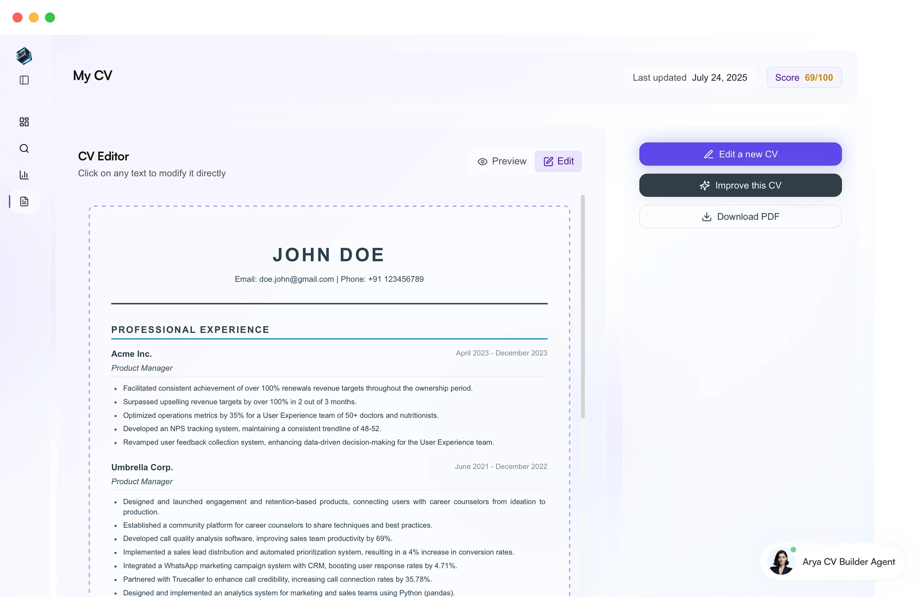 Arya’s AI Resume Editor scans your resume for impact, formatting, and keyword alignment enhancing every section to match role-specific demands and increase recruiter response.